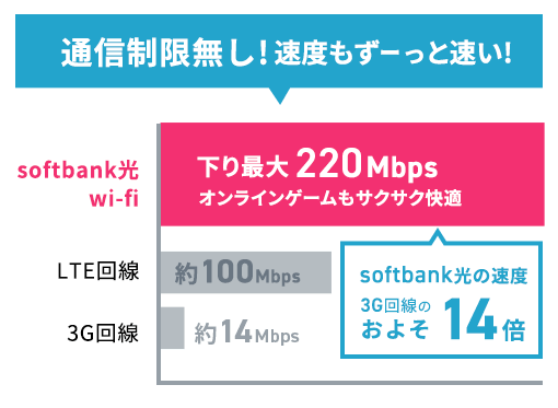 - SoftBank 光のWi-Fiは、最大220Mbpsの高速通信!さらに通信制限も一切かかりません!