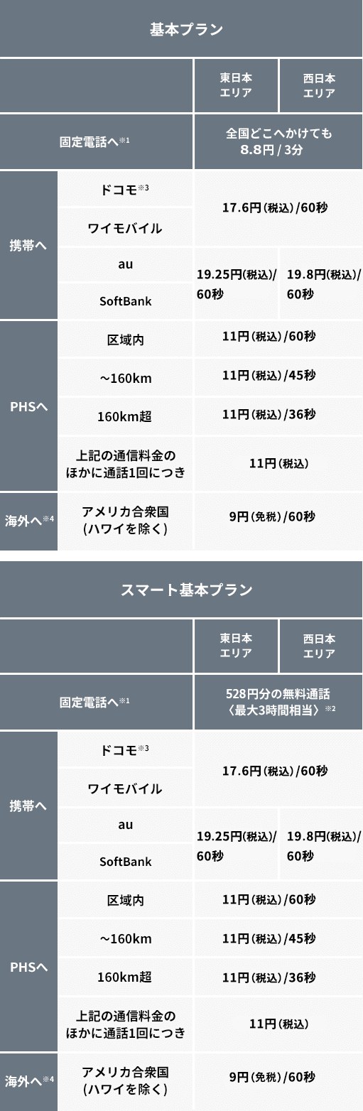 ※2 携帯電話、PHS、050IP電話、国際電話などへの通話は無料通話対象外になります。余った分は翌月に繰り越して利用できます。※3 テレビ電話、ワンナンバーは除きます。※4 国際電話の通話料は免税です。