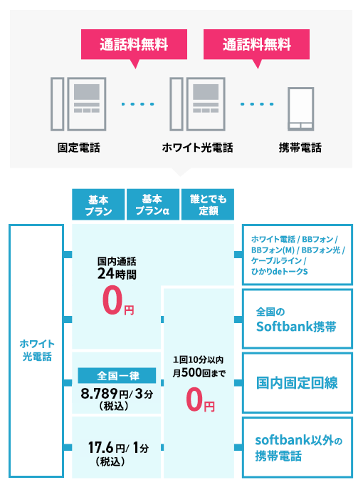 - 「とにかくたくさん電話したい」「電話の固定費を節約したい」など、ライフスタイルに合わせて選べます。どのプランでも、ホワイト光電話やBBフォン同士、ソフトバンク携帯への通話料は無料!