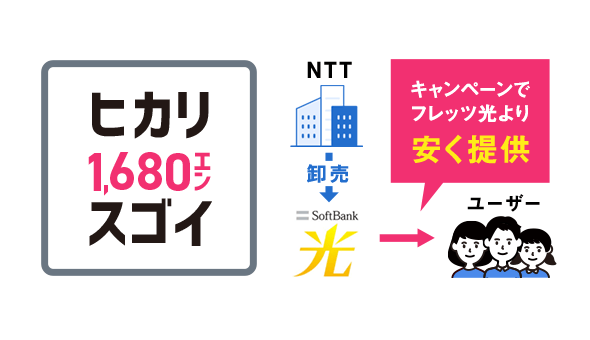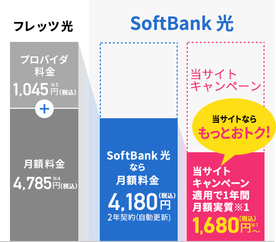 "SoftBank 光"なら、月額料金が格段におトク!フレッツ光と同じ最大1Gbpsの高速通信で、なんとプロバイダー料もコミコミの月額実質1,680円税込〜※1に!