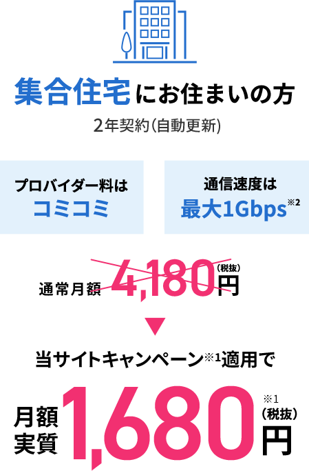 - • 集合住宅タイプ:集合住宅タイプ月額料金4,180円税込ー実質月額割引料金2,500円
