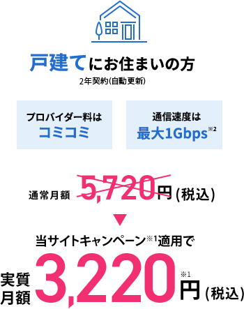 (乗り換え新規キャンペーン30,000÷12ヶ月分)=月額実質1,680円税込~詳細はコチラ - • 戸建てタイプ:集合住宅タイプ月額料金5,720円税込ー実質月額割引料金2,500円
