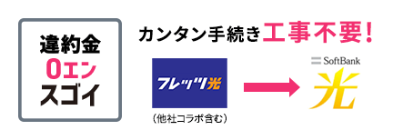 「フレッツ光」「他社コラボ光」をご利用中なら、お乗り換えラクラク!カンタンな手続きだけで、工事も必要ナ シ!しかも解約にかかる違約金を、ソフトバンクがなんと満額負担!
